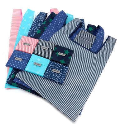 ダークブルーの五芒星、ウォーターブルーの五芒星、ダークブルーのベイビーズブレス、ピンクのピンストライプ、ブルーのピンストライプ、ダークブルーのドット
